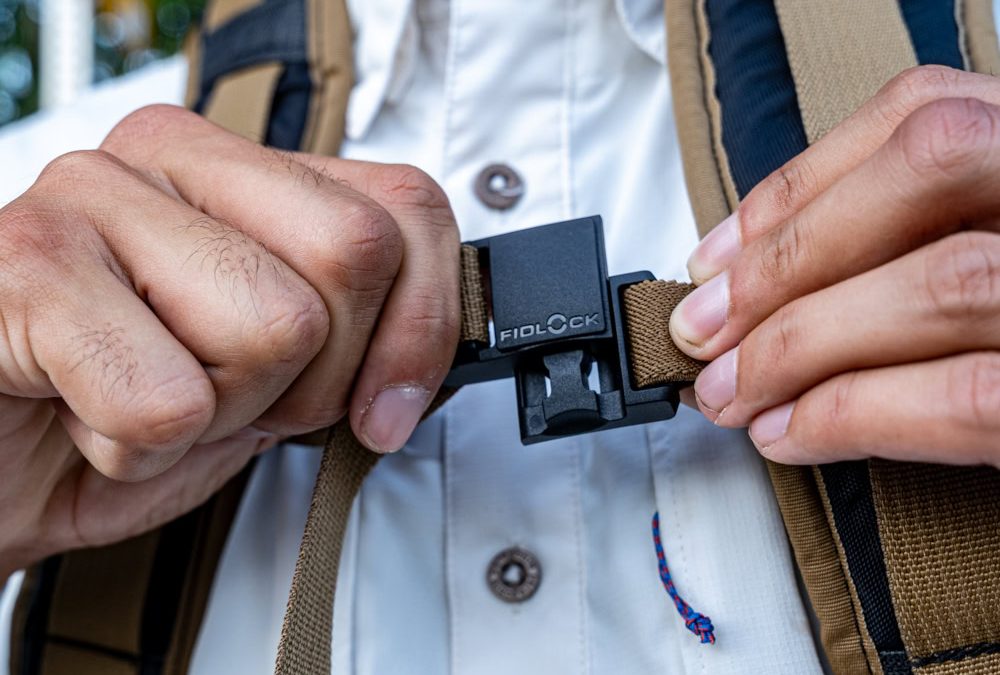 A man clips together the magnetic sternum strap on his Muse Cicada